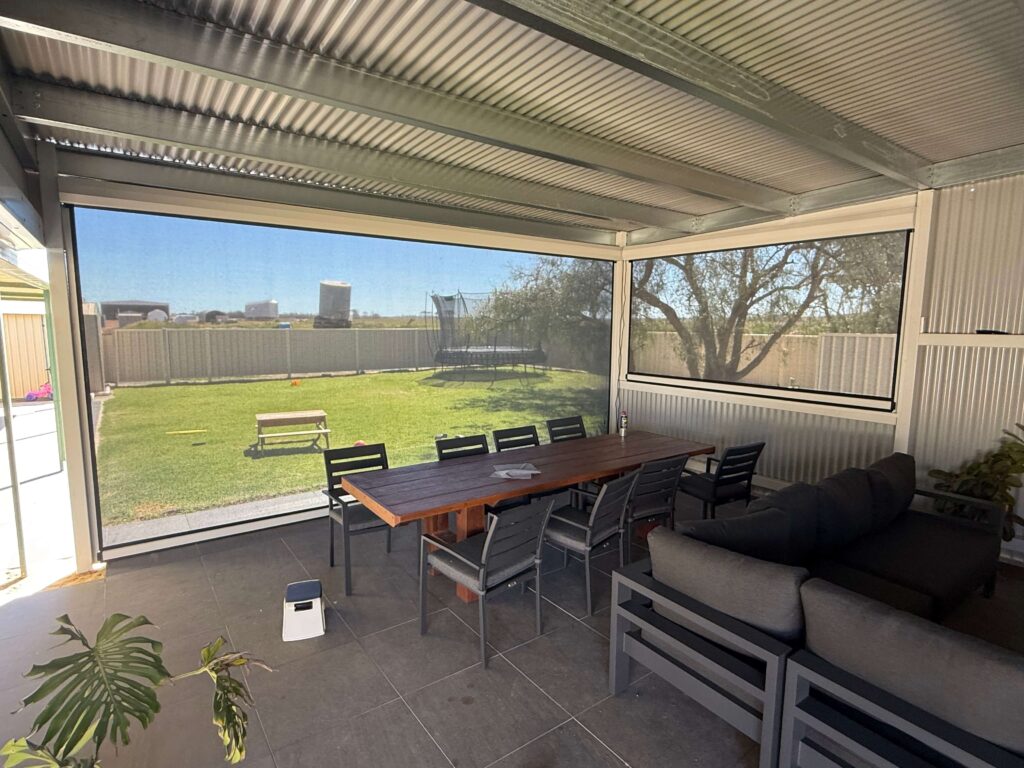 Dongara backyard enclosed with Ziptrak outdoor blinds for heat control, airflow, insect protection, and comfortable outdoor entertaining.
