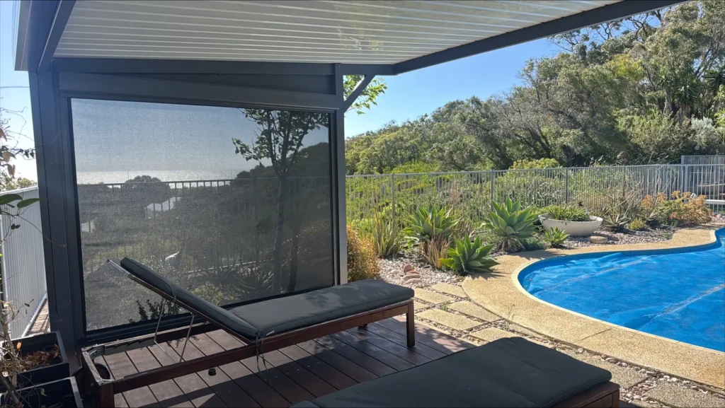 Bunbury poolside fitted with a Ziptrak outdoor blind to block harsh sun, reduce heat, and create a more comfortable relaxation area.
