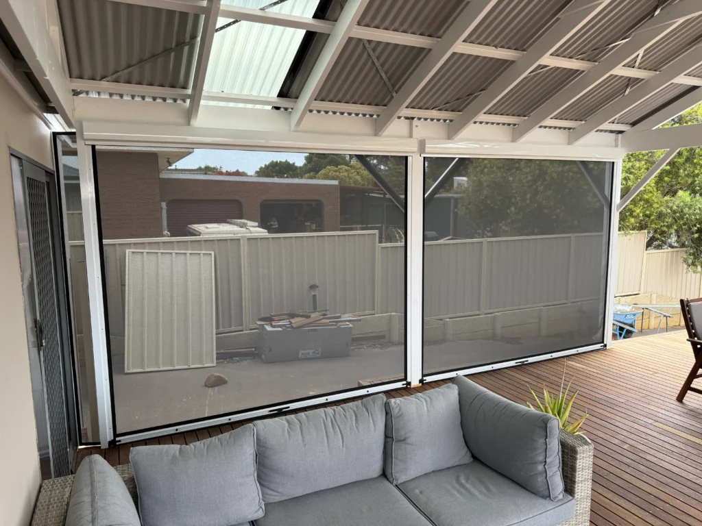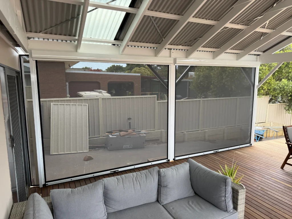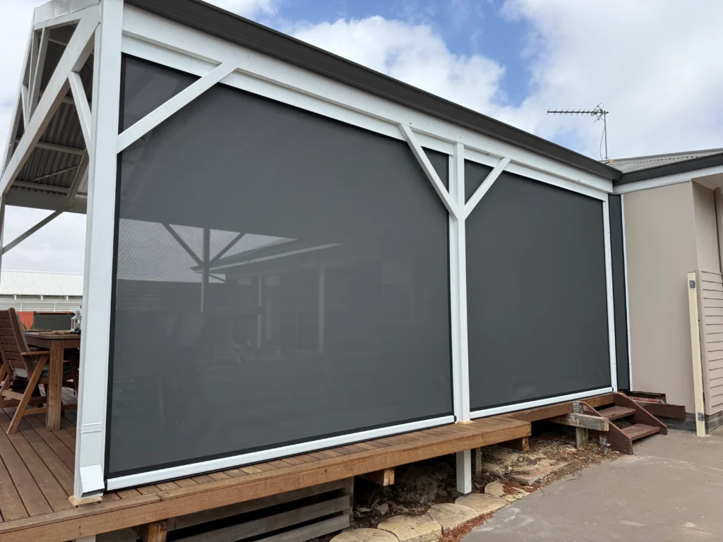 Travis installed Ziptrak® outdoor blinds to achieve exactly that. The blinds provide privacy and shelter from the elements, while also acting as a visual barrier along the edge of the deck, creating a defined zone separate from the side walkway.