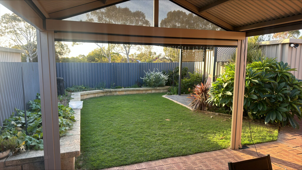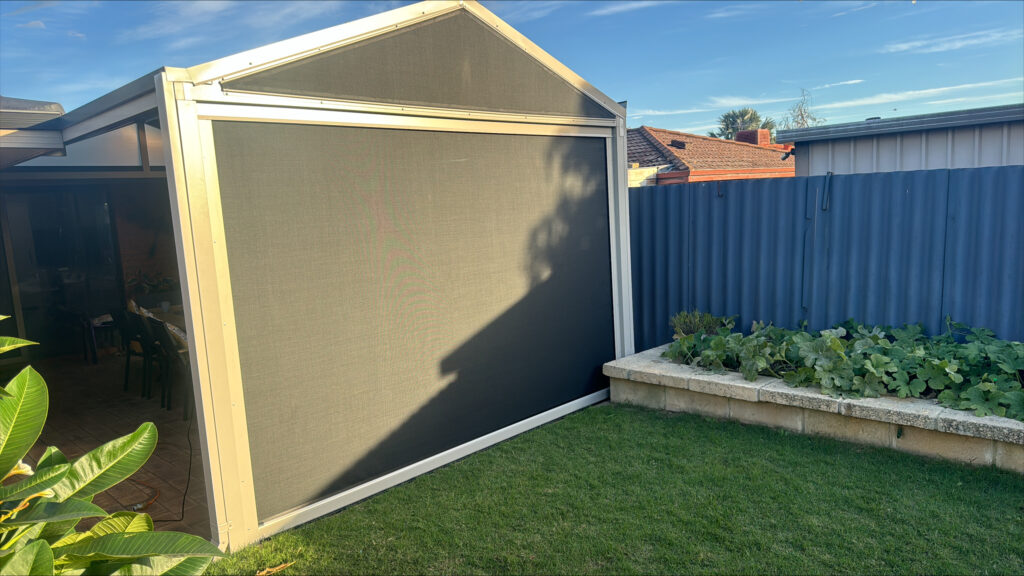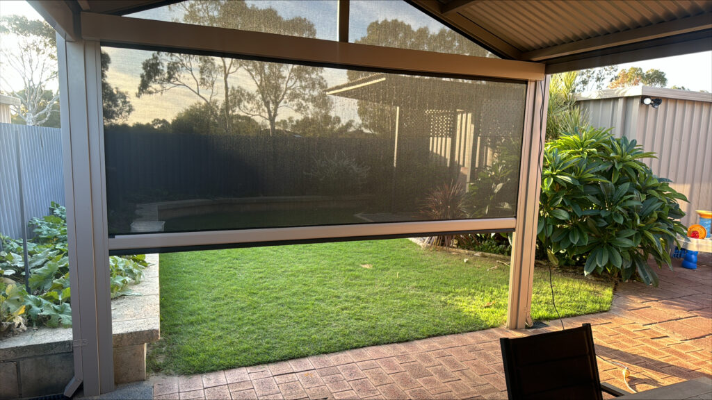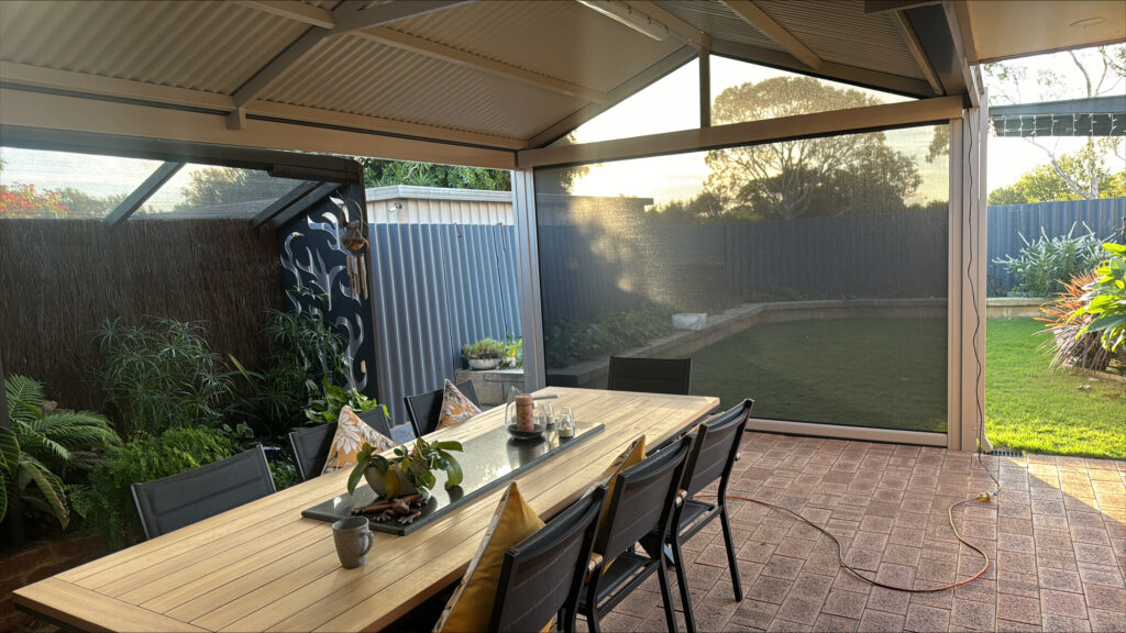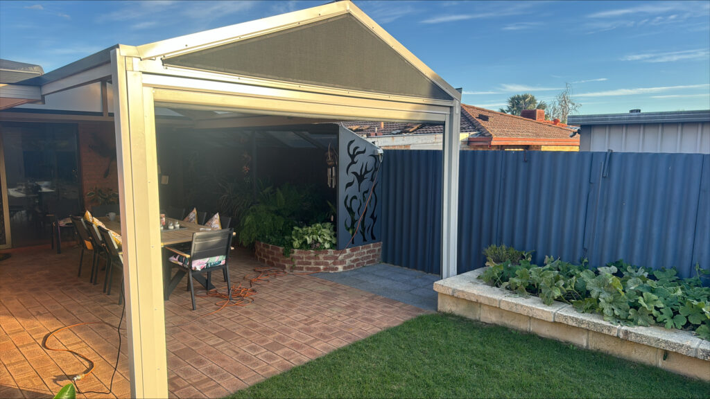 This installation in Canningvale was designed to take a scorching hot and often windy outdoor entertaining area and turn it into the perfect place for year-round enjoyment.