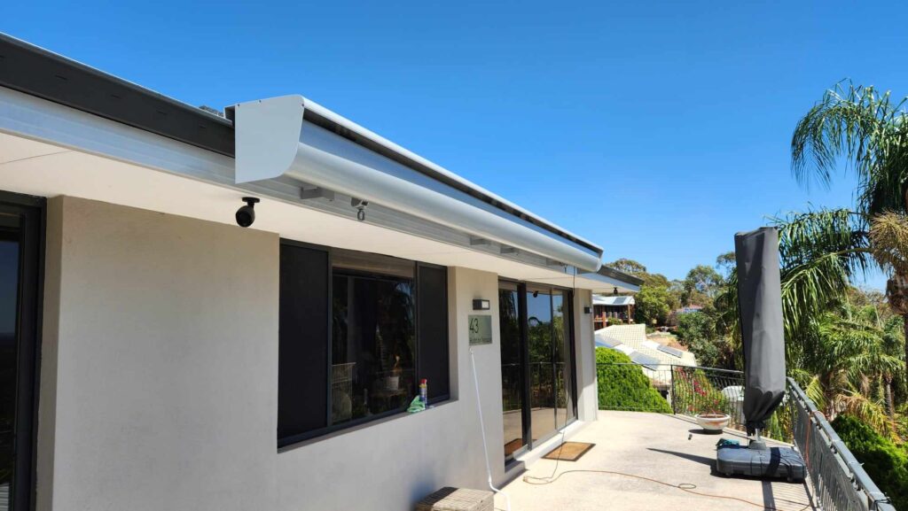 1 x Folding Arm Awning, with the aluminium components powder-coated in Silver, adds a functional feel and complements this home’s existing colours.